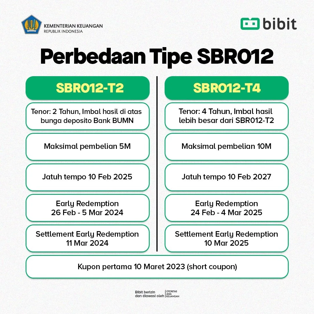 Dilansir dari Kemenkeu, periode penawaran SBR tahun 2023 dengan seri 012 (SBR012) bakal dimulai pada 19 Januari 2023 sampai 9 Februari 2023. Perlu diketahui bahwa SBR tahun 2023 ini akan ada dua tipe Saving Bond Ritel seri 012 (SBR012) yang akan hadir yaitu SBR012-T2 dan SBR012-T4. Berikut perbedaan antara kedua jenis SBR012 tersebut.
