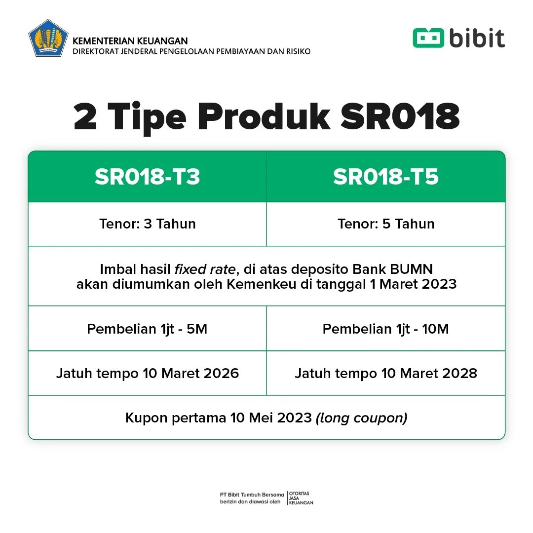 Perlu diketahui bahwa Sukuk Ritel Seri 018 (SR018) kali ini ada dua tipe yang bisa dipilih. Berikut detail karakteristik dua tipe SR018 tersebut: