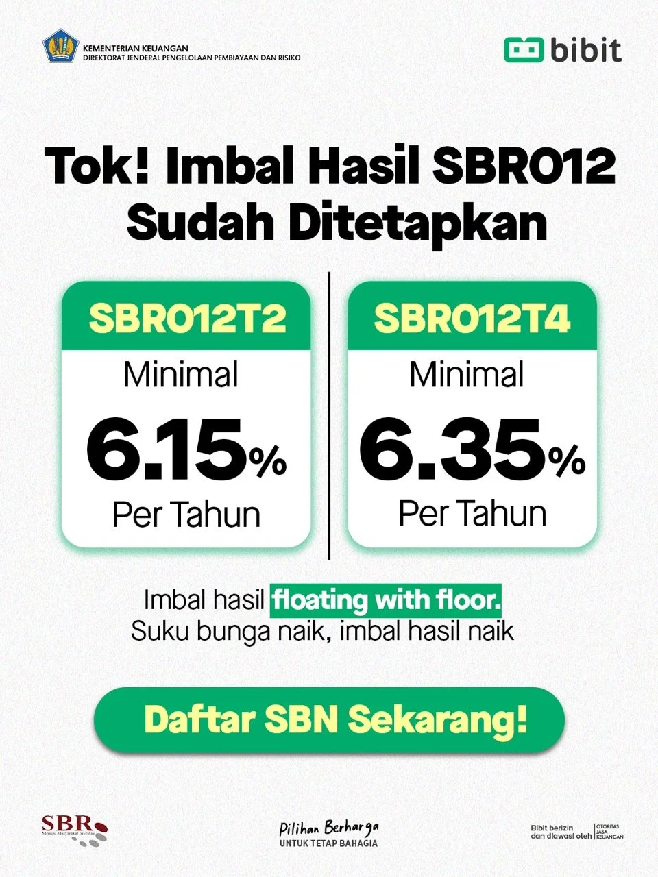 Perlu diketahui bahwa besaran kupon atau bunga dari SBR012 telah ditetapkan pemerintah dengan rincian SBR012-T2 dengan tenor selama 2 tahun sebesar 6.15% dan kupon SBR012-T4 untuk tenor selama 4 tahun yakni sebesar 6,35% dengan jenis kupon mengambang (floating with floor).