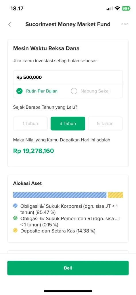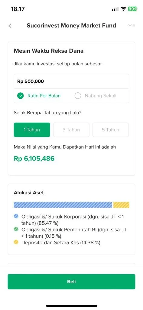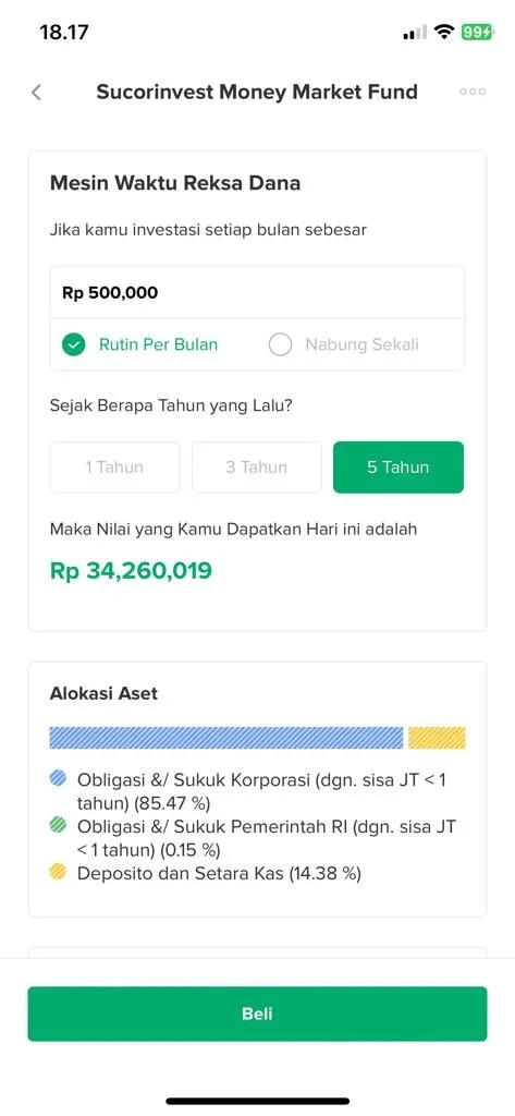 Sebagai contoh, Dira mulai nabung reksadana di Sucorinvest Money Market Fund dengan nominal Rp 500ribu tiap bulannya. Maka dalam jangka waktu 1 tahun Dira sudah mendapatkan keuntungan sebesar Rp 6.105.486, 3 tahun mendapatkan Rp 19.278.160, dan 5 tahun mendapatkan Rp 34.260.019.