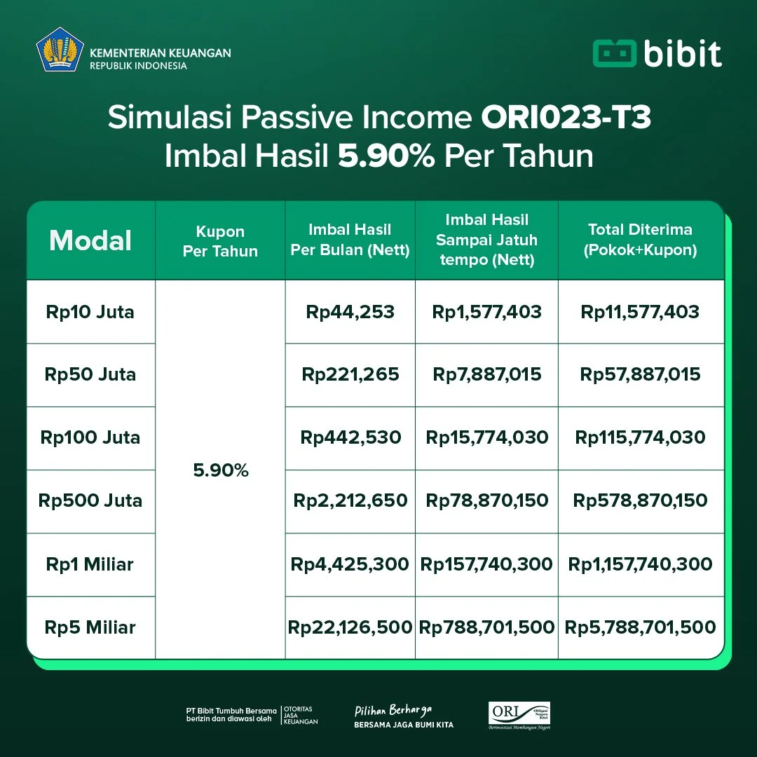 Sebelum melakukan simulasi return ORI023, terlebih dahulu kamu memang harus mengetahui besaran kupon atau imbal hasilnya. Lalu berapa kupon ORI023 tersebut? Dalam rilis yang dikeluarkan pemerintah beberapa hari yang lalu, kita memang sudah bisa mengetahui besaran kupon ORI023 yaitu 5,90% untuk ORI023-T3 dan 6,10% untuk ORI023-T6.