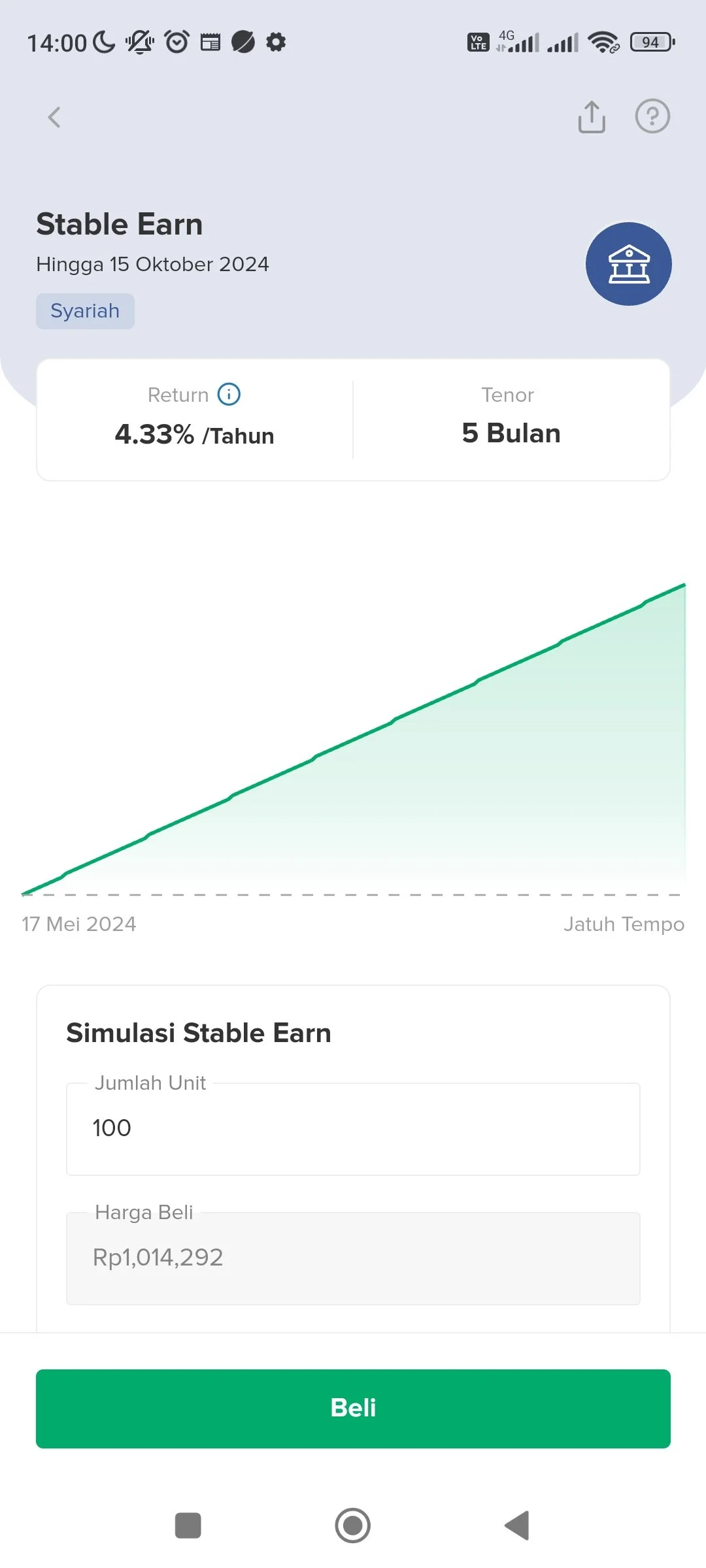 Return Stable Earn Syariah bersifat tetap. Return di hari beli adalah return yang diterima hingga jatuh tempo. Contohnya, untuk return Stable Earn Syariah pada 15 Mei 2024 jam 14.00 WIB senilai 4,33% per tahun, jika hold sampai 15 Oktober 2024.
