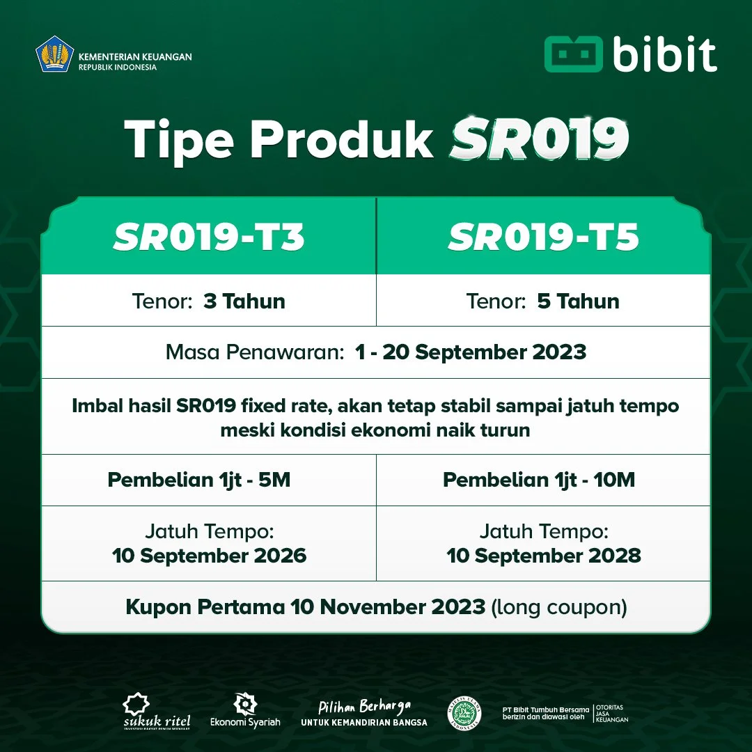Untuk Sukuk Ritel seri 019 (SR019) kali ini, ada dua tipe produk yang bisa kamu pilih yakni SR019-T3 (tenor 3 tahun) dan SR019-T5 (tenor 5 tahun). Berikut detail karakteristik dua tipe SR019 tersebut: